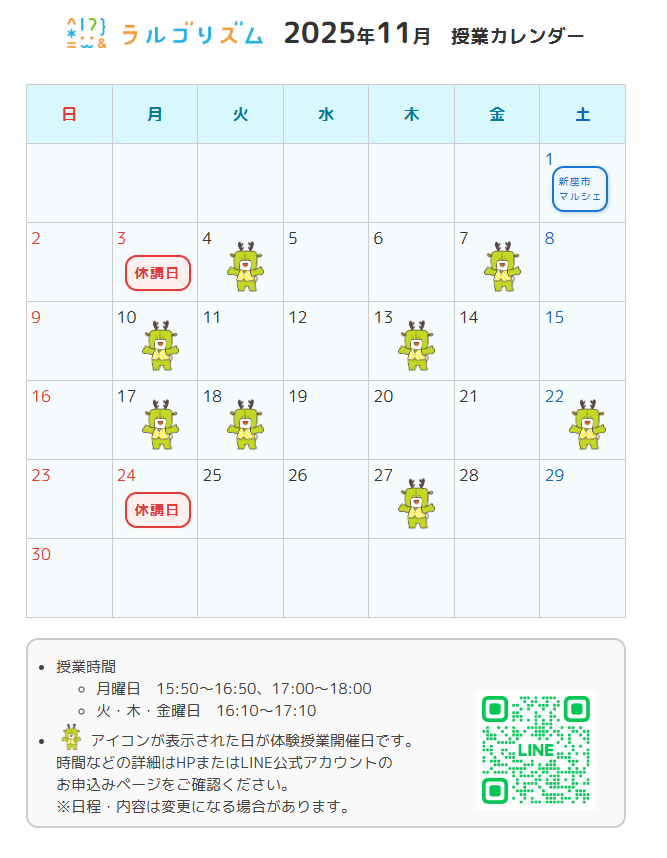 2025.11.01 【石神教室】2025年11月の授業カレンダー 11月は下記の日時で体験授業を開催しています。 初の土曜日開催も予定しています。 体験授業の詳細については体験授業ページをご確認ください。 11月 4日(火) 16:10~17:10 11月 7日(金) 16:10~17:10 11月10日(月) 17:00~18:00 11月13日(木) 16:10~17:10 11月17日(月) 17:00~18:00 11月18日(火) 16:10~17:10 11月22日(土) 10:00~11:00 11月27日(木) 16:10~17:10 Post Share Hatena RSS feedly Pin it 【石神教室】2025年10月の授業カレンダー