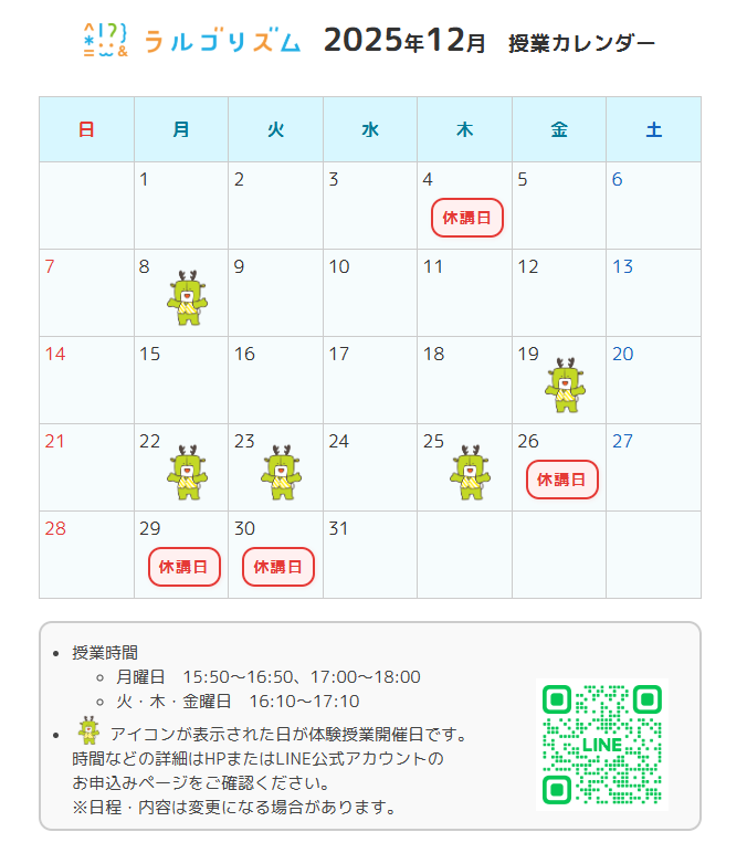 - 12月25日(木) 10:00~11:00、14:30~15:30、16:10~17:10